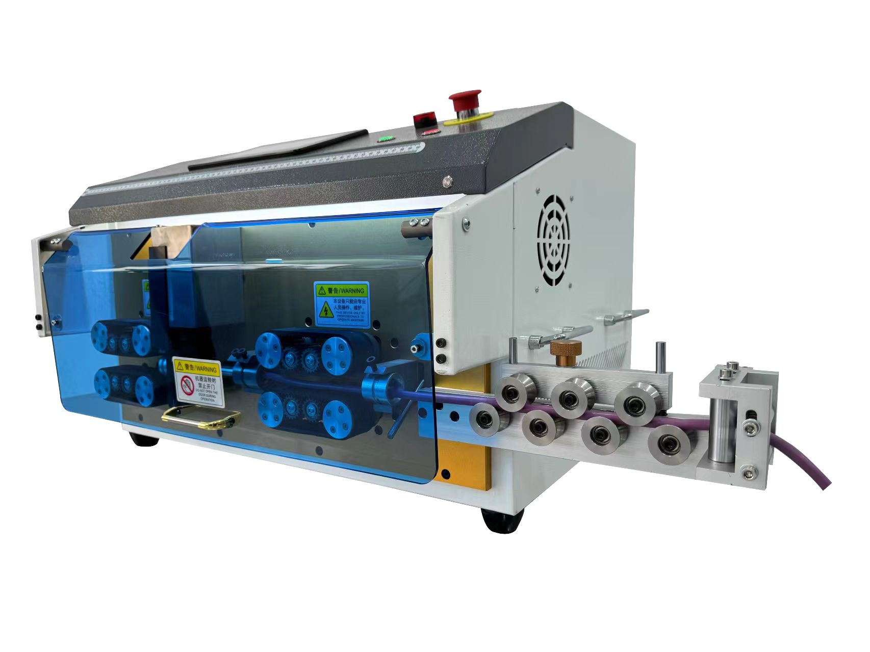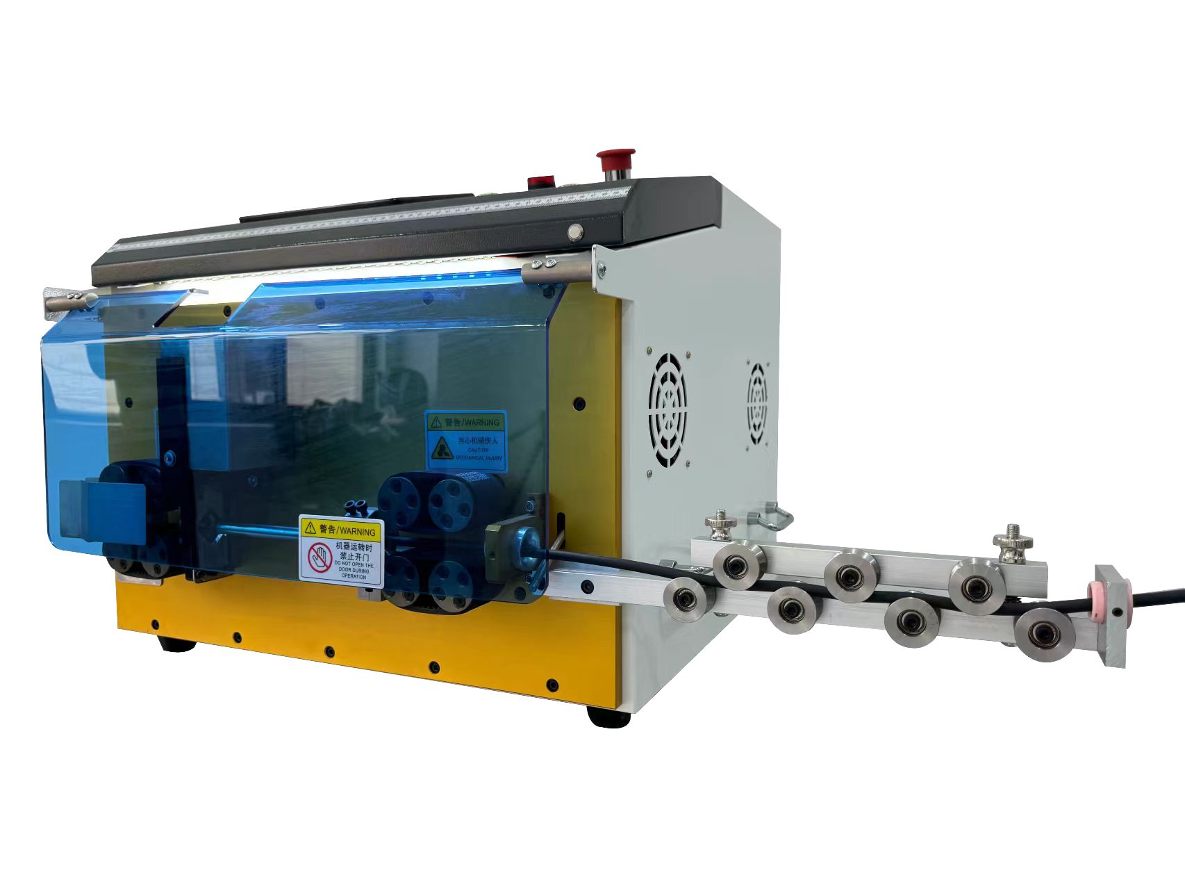 2.本机还带有自动提轮和跳导管功能,自动提轮是指在剥线头时出线轮可以自动张开进行避让,跳导管功能是指在剥线尾时进线导管自动抬起进行避让,从而增加了剥皮长度范围。